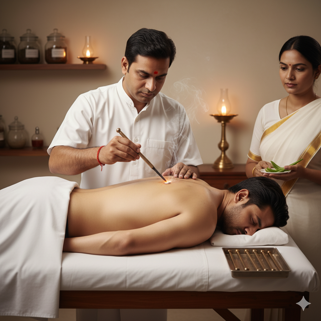 Ancient Ayurvedic thermal therapy using controlled heat application to treat chronic pain conditions, particularly effective for joint and muscle disorders.