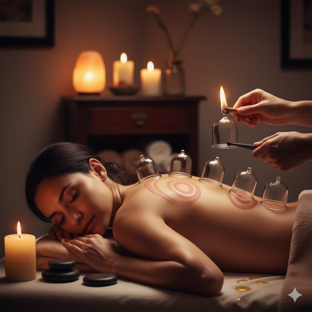 Traditional hot cupping therapy that uses heated cups to create suction on the skin, promoting blood circulation and relieving muscle tension.