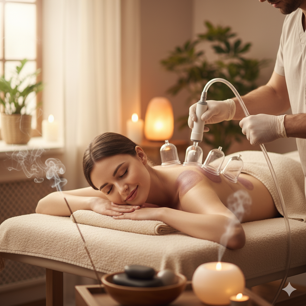 Modern vacuum cupping technique that creates controlled suction to treat muscle pain, improve circulation, and promote healing in targeted areas.